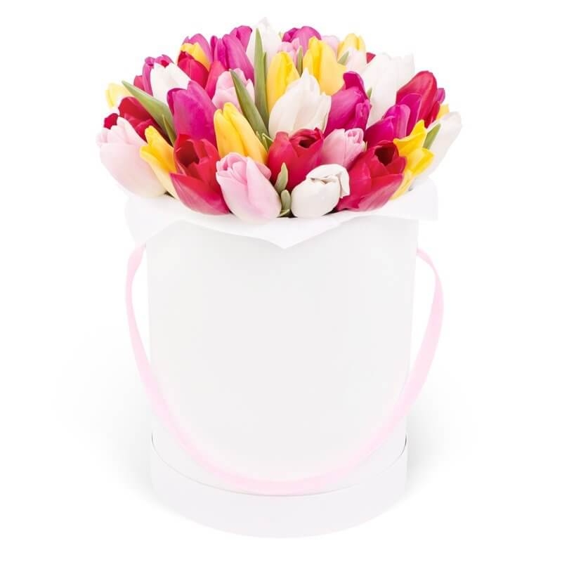 Букет состоит из MIX из 35 тюльпанов, коробка, оазис.