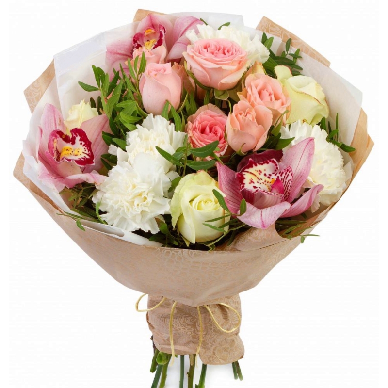 Букет состоит из 10 роз, 4 гвоздики, 3 орхидеи, зелень, крафт, атласная лента.