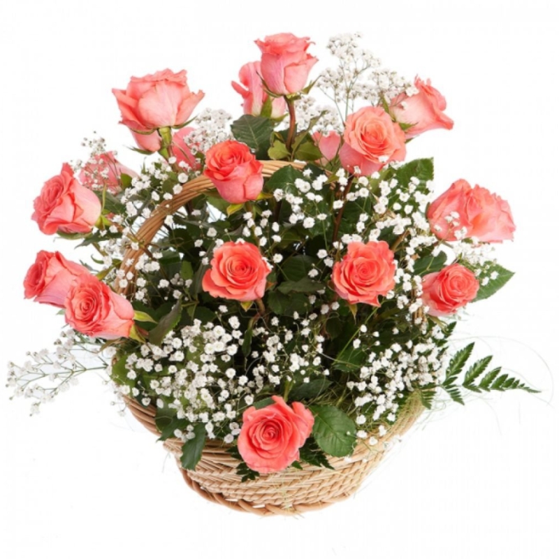 Корзина с розами и гипсофилой